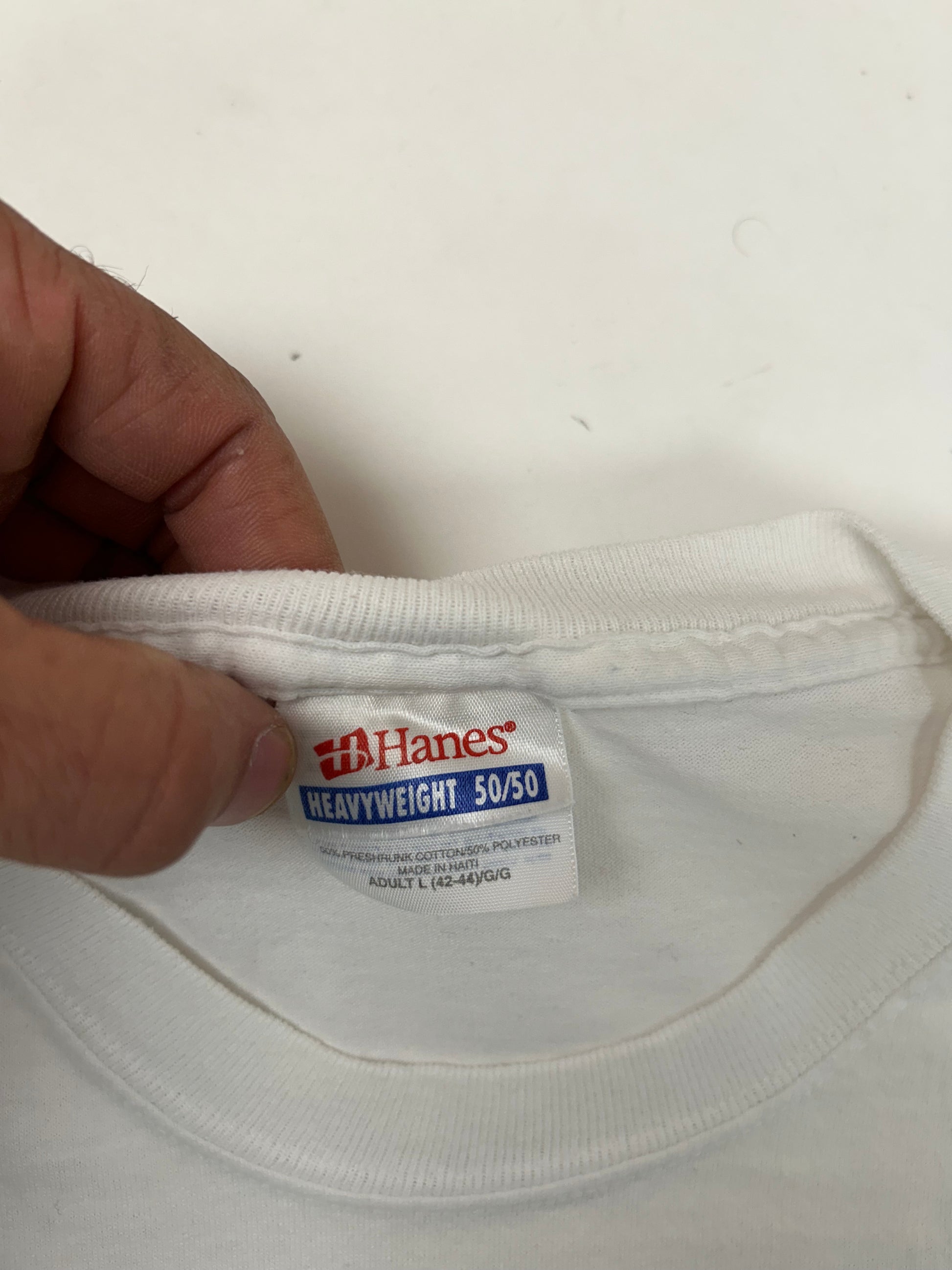 This tee is printed on a Vintage Hanes 50/50 Blend Made In Haiti White Tee.