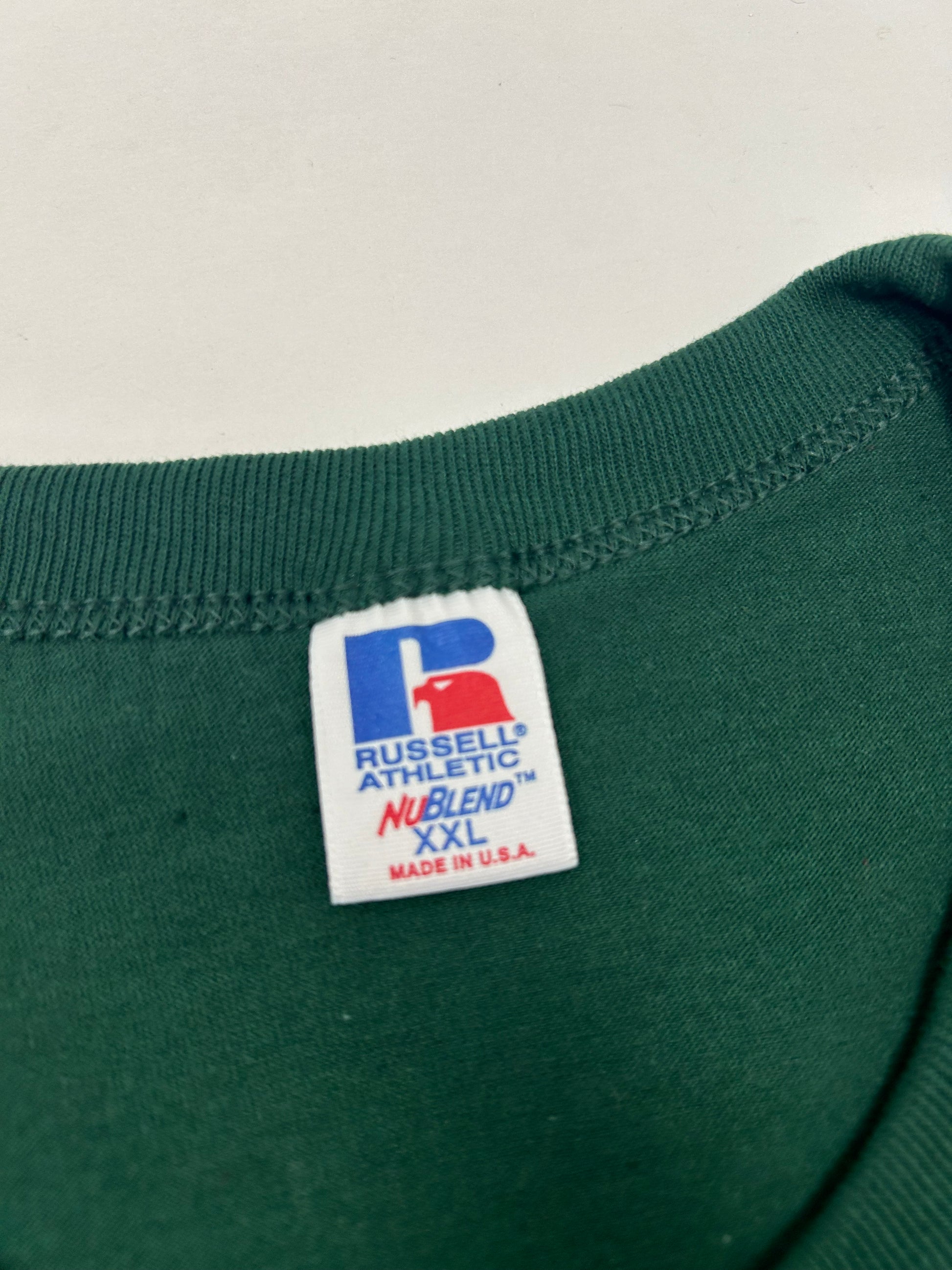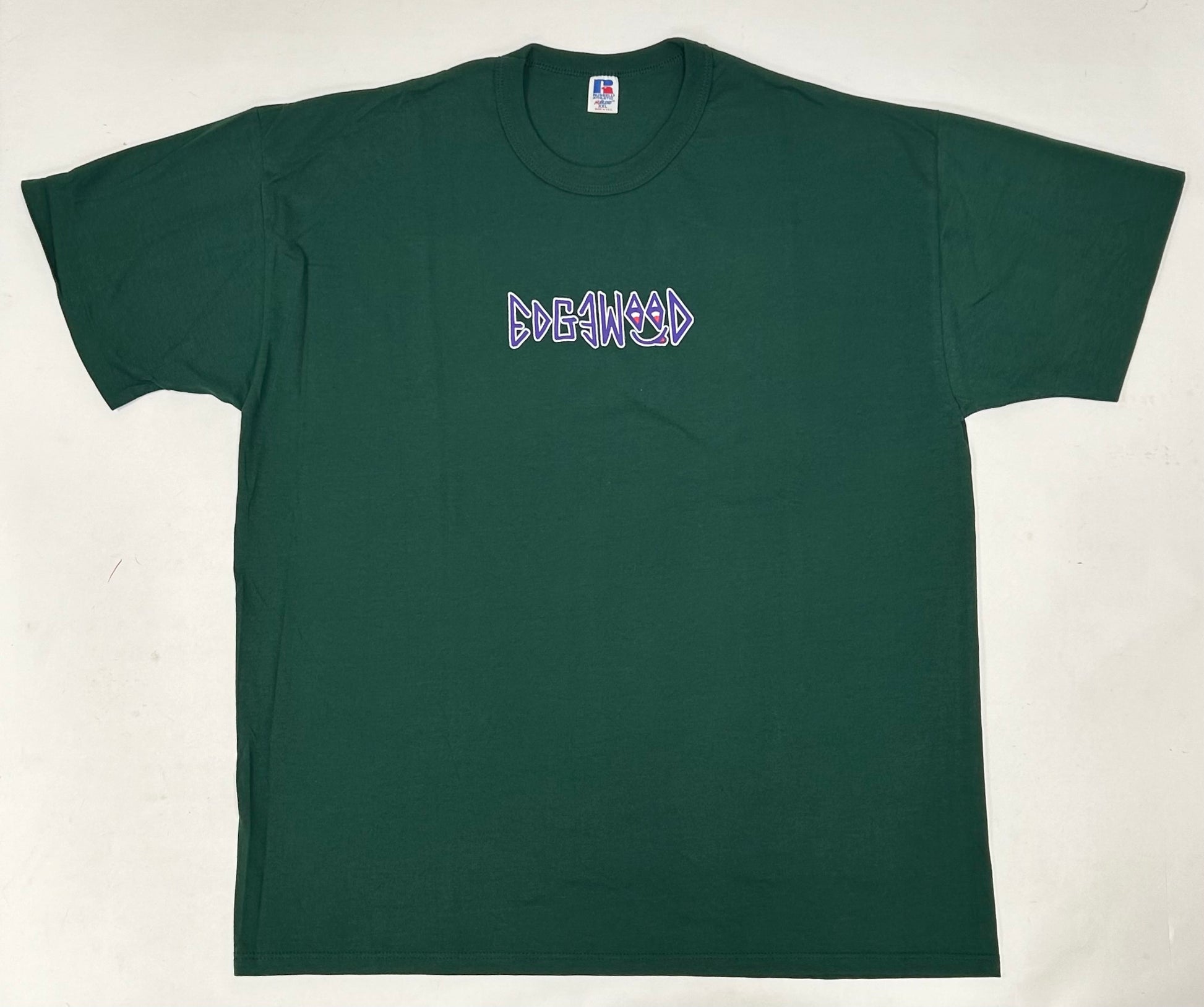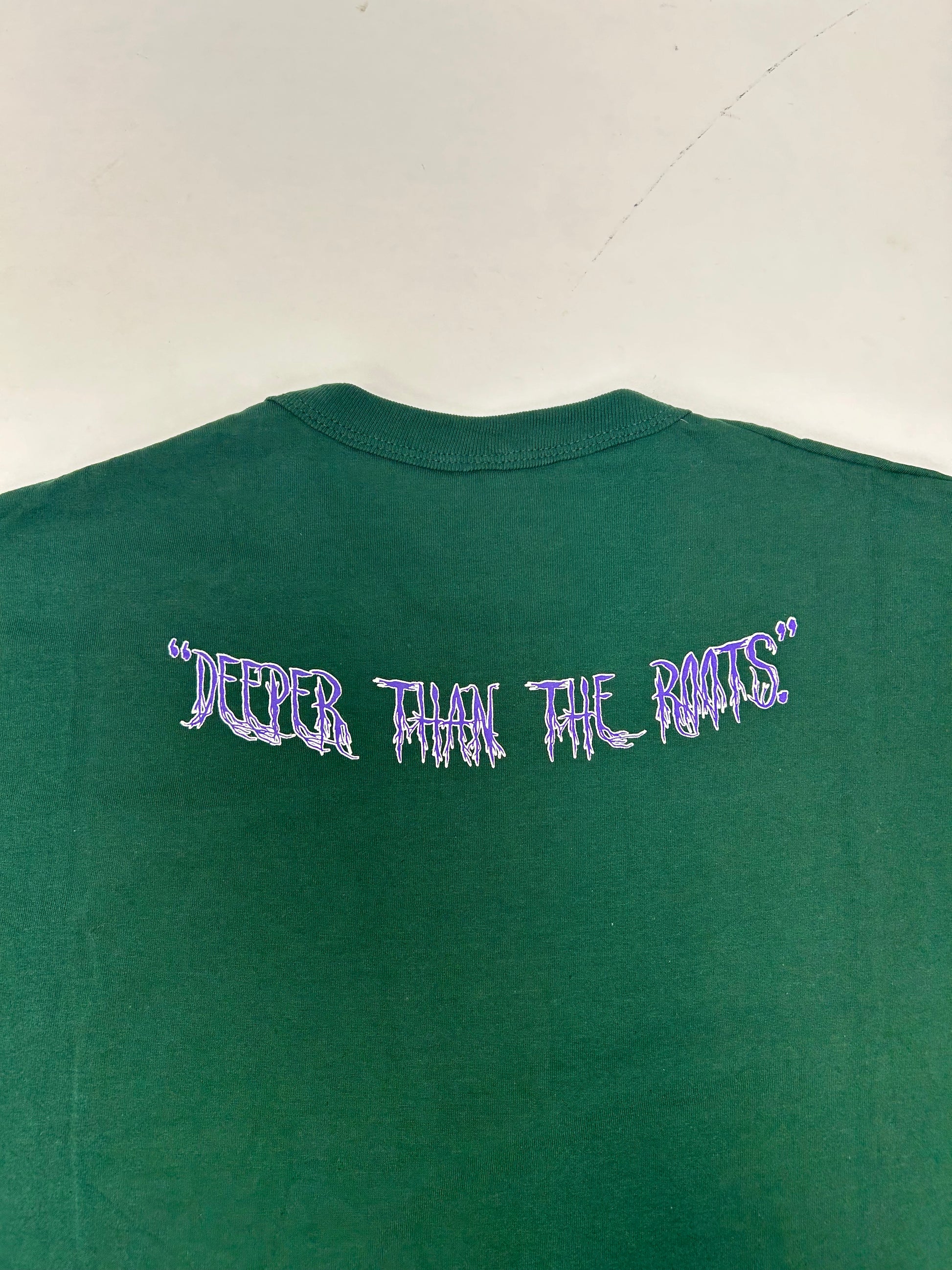 Edgewood NJ first edition “Deeper Than The Roots.” Tee 2XL 26.5x33 Inches 90s Russell Athletic NuBlend 50/50 USA Forest Green