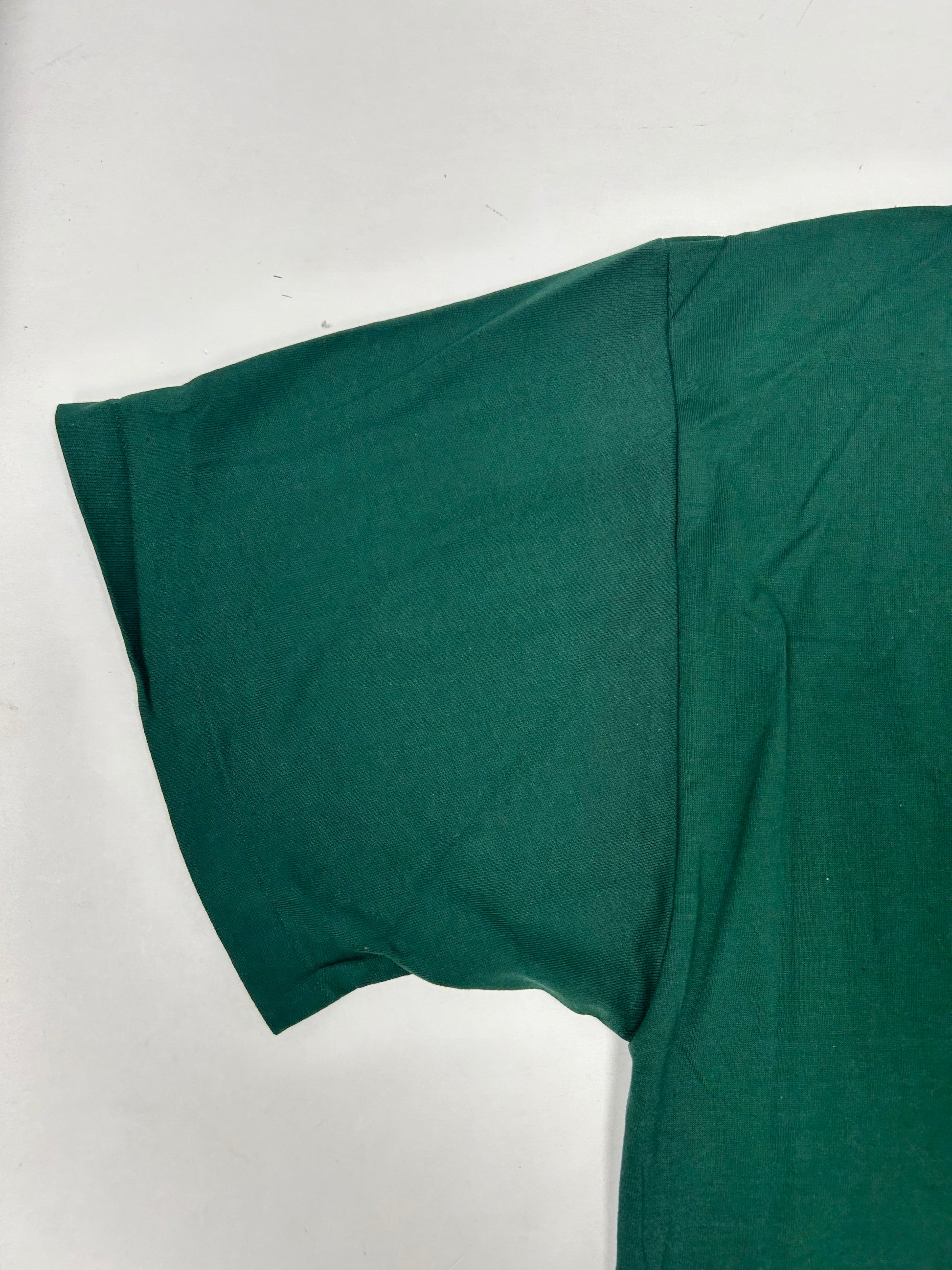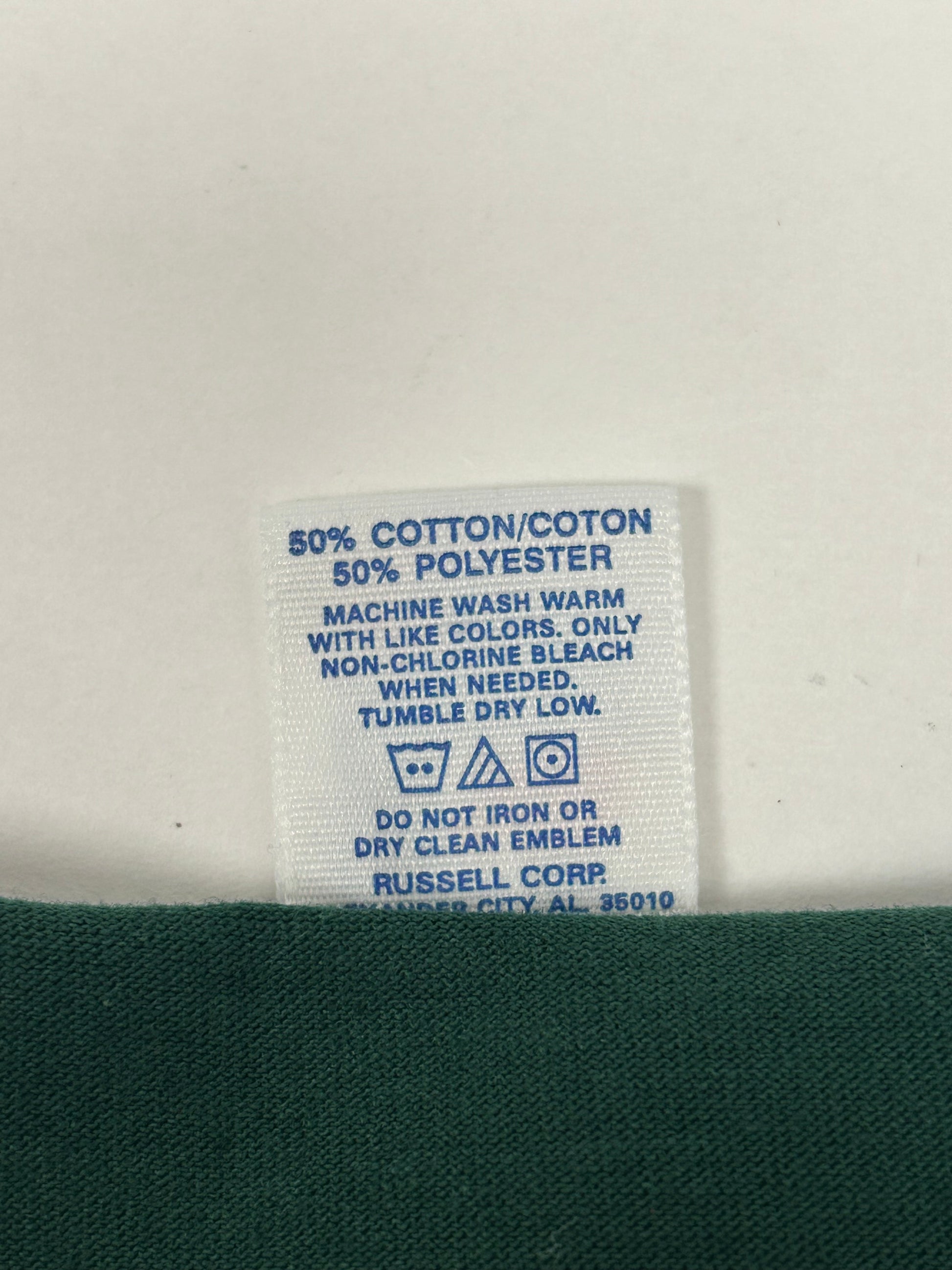 This tee is printed on a 90s Russell NuBlend 50% Cotton 50% Polyester Made In USA Forest Green Color Tee.